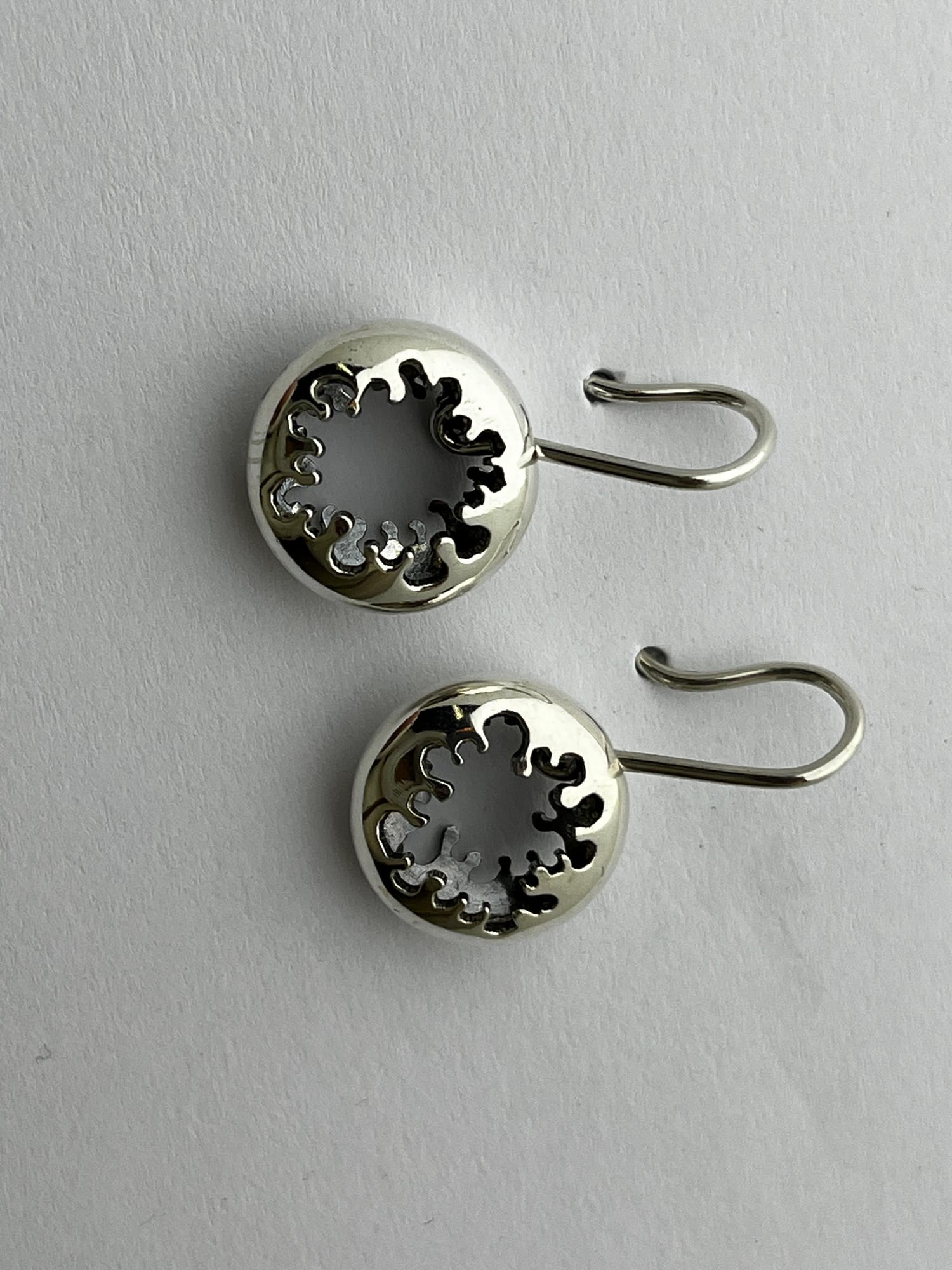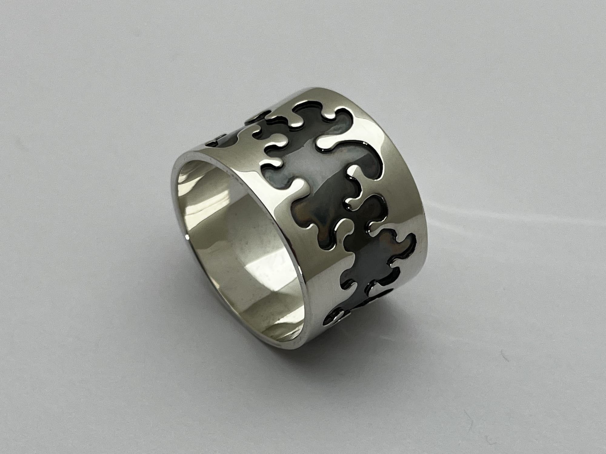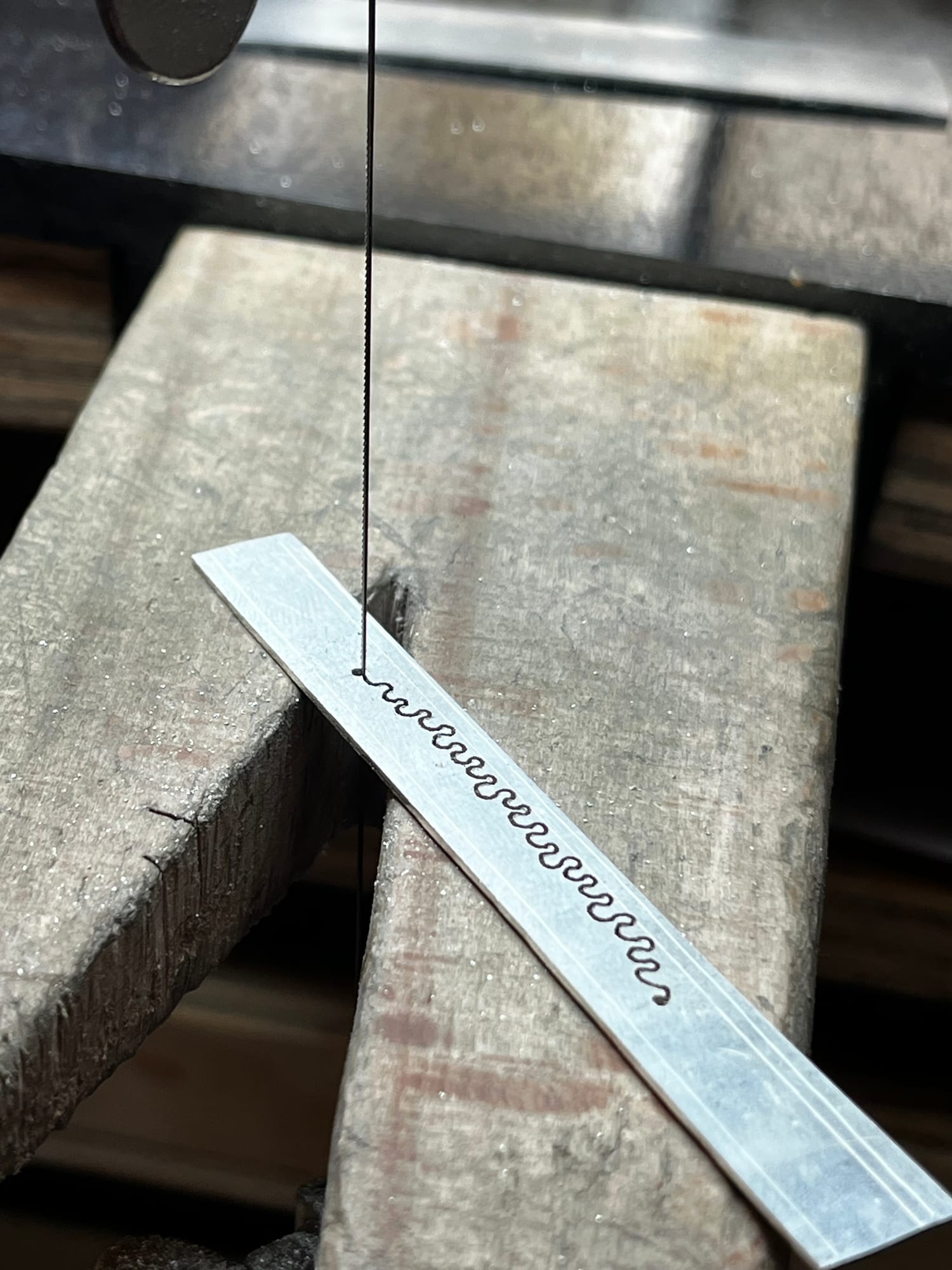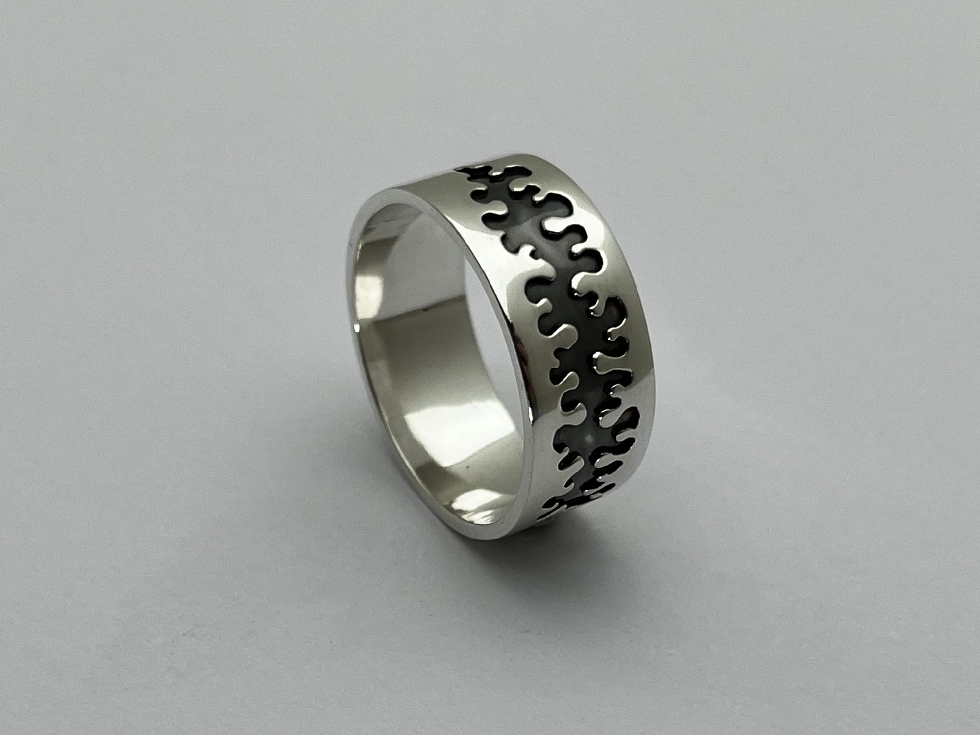 Het werk begint bij het observeren van structuren uit de natuur, vertaald naar een lijn als uitgangspunt. Ik werk met hergebruikte resten zilver, die ik omsmelt en giet tot een baat en vervolgens uitwals tot plaatmateriaal. Uit deze platen zaag ik het patroon direct, waarbij het zich tijdens het werken ontwikkelt binnen duidelijke grenzen.
