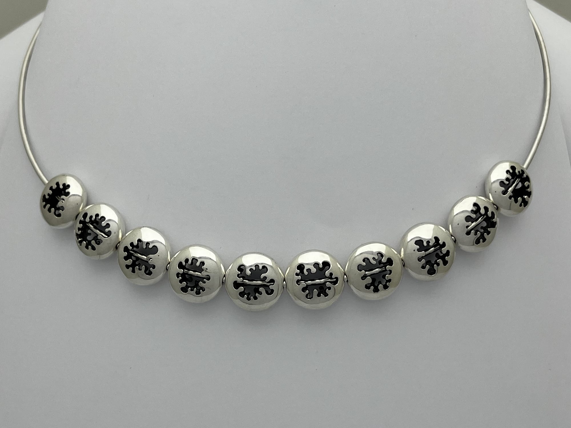 In de colliers wordt de lijnstructuur doorgezet naar grotere en meer ruimtelijke vormen. De onderdelen worden afzonderlijk opgebouwd en vervolgens samengebracht tot één geheel. Tijdens het samenstellen ontstaat een balans tussen ritme, vorm en draagbaarheid.