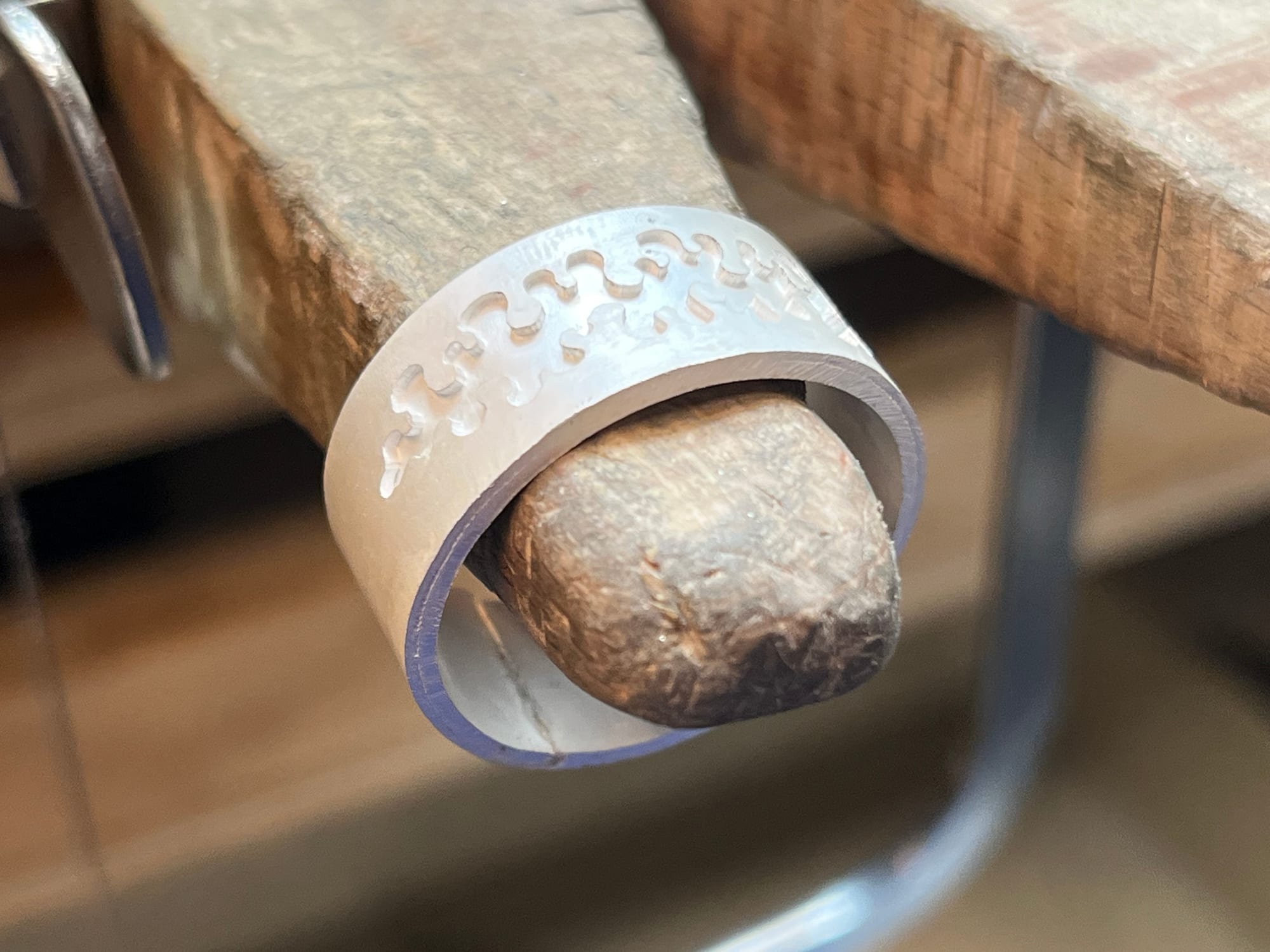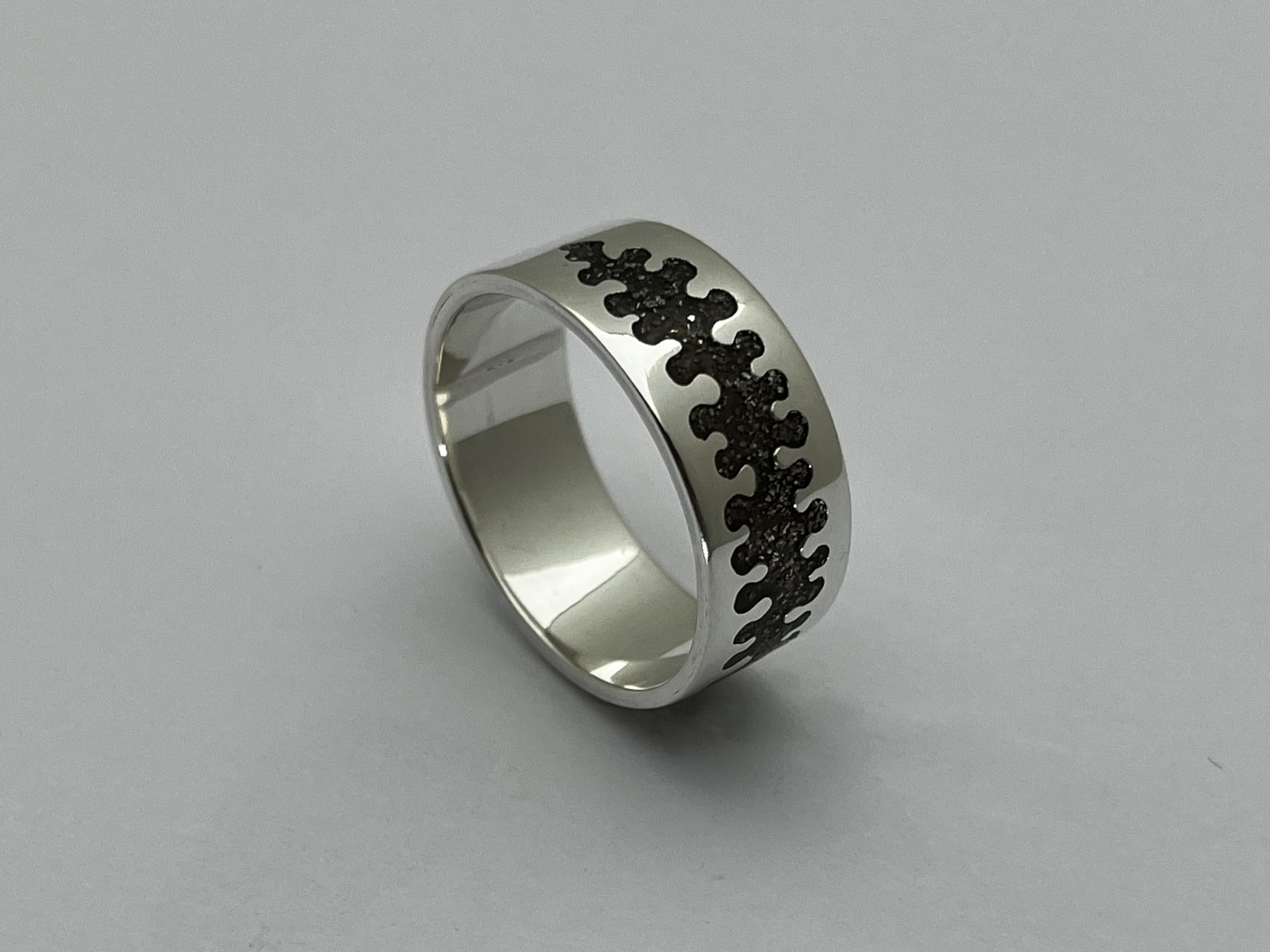 De ringen vormen de basis van de collectie en laten de lijnstructuur het meest direct zien. Het patroon wordt tijdens het zagen opgebouwd en volgt het ritme dat ontstaat in het proces. Na het vormen en afwerken wordt het oppervlak bewerkt om de lijn en diepte te versterken.